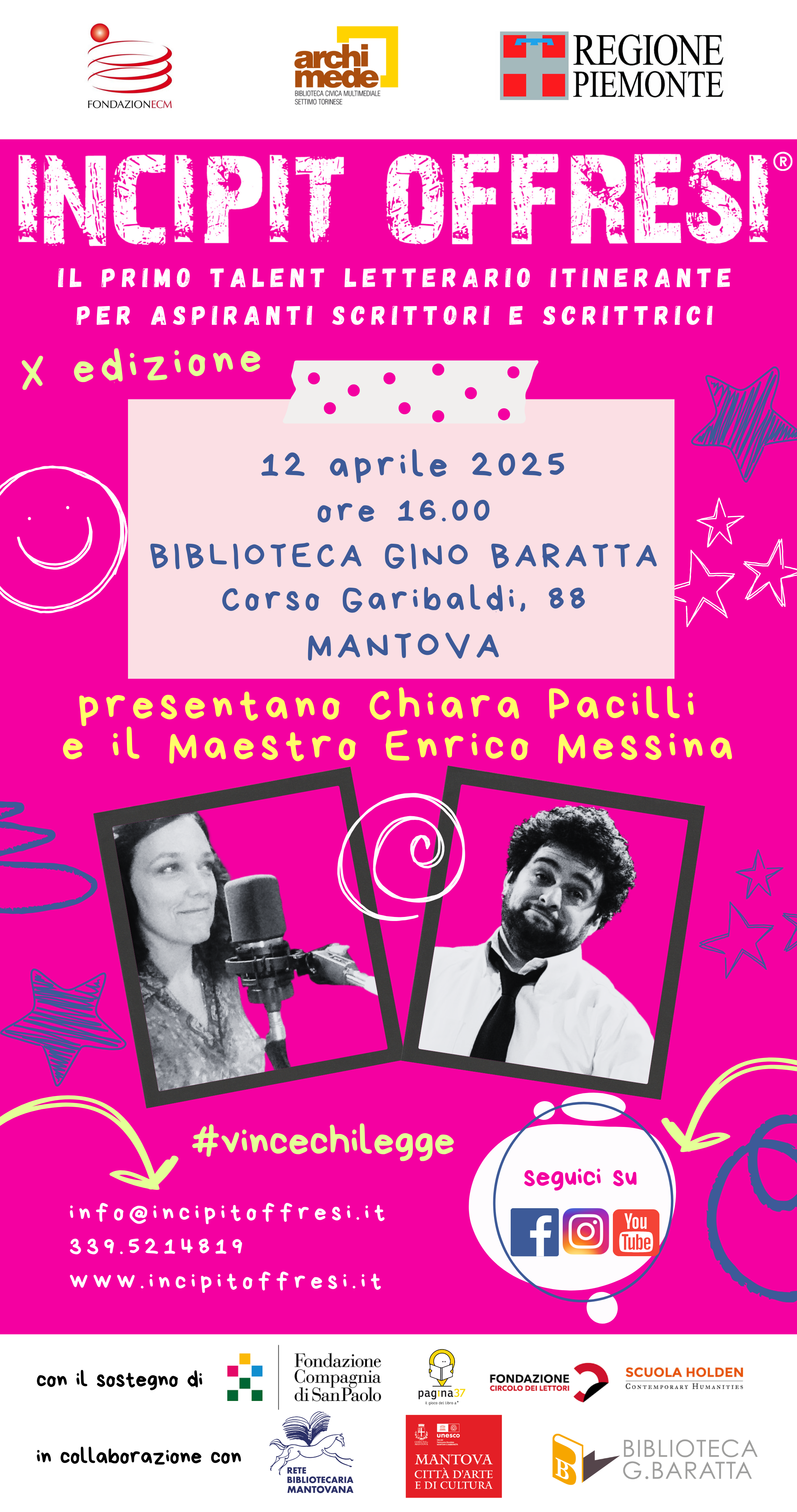 Incipit Offresi è un’iniziativa ideata e promossa dalla Fondazione ECM – Biblioteca Archimede di Settimo Torinese e Regione Piemonte, con il sostegno di Fondazione Compagnia di San Paolo e la collaborazione di Fondazione Circolo dei lettori, Scuola Holden, Associazione Pagina 37, Emons Edizioni e FUIS – Federazione Unitaria Italiana Scrittori.